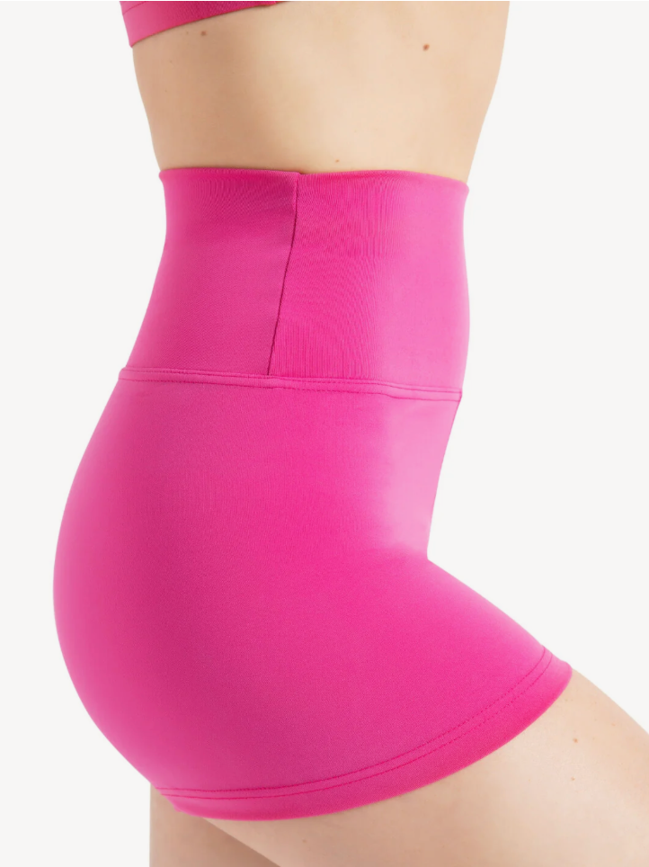 Elevate your dance game in the High Waisted Short. Made of a nylon and spandex blend that is both soft and resilient, these shorts feature an elastic-free waist that can be left as is or folded over for a low-rise look. Perfect for studio, gym, and everyday wear. Available in both adult and child sizes.