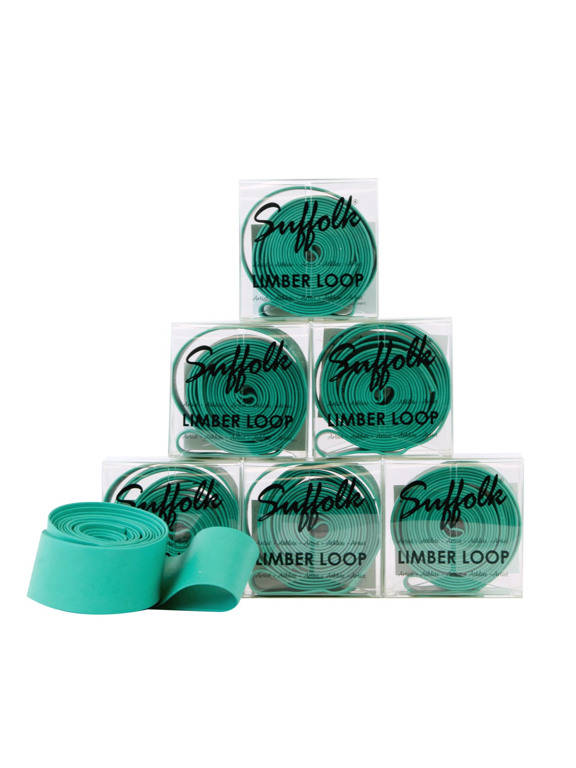 Suffolk's Limber Loop is a hands free resistance band made specifically for dancers. This band is used to stretch and increases flexibility in the legs and back. Many ballet instructors have added limber loops to their stretch classes to work on extension and placement. The loop is the perfect length for dancers to use without the danger of longer bands in the dance market that require wrapping around shoulders or arms, and can cause injury.